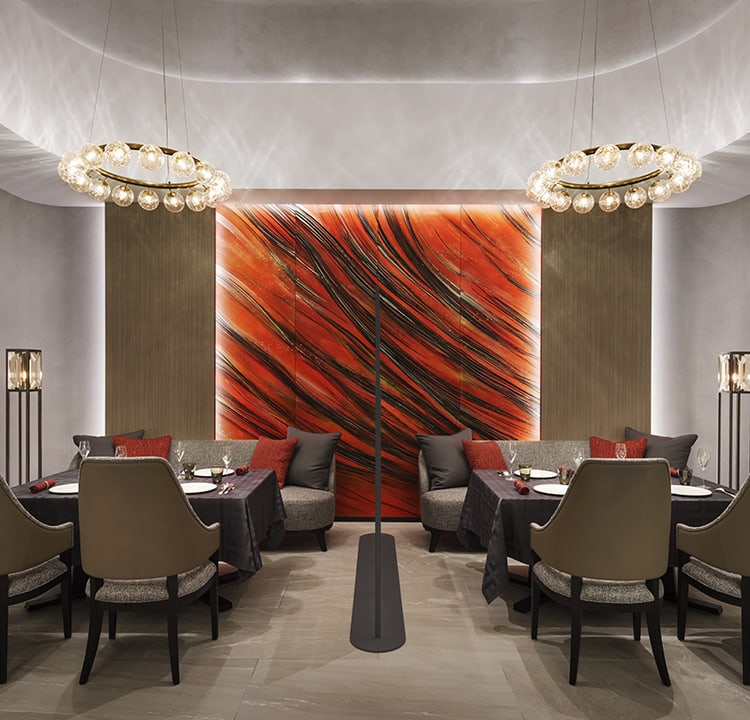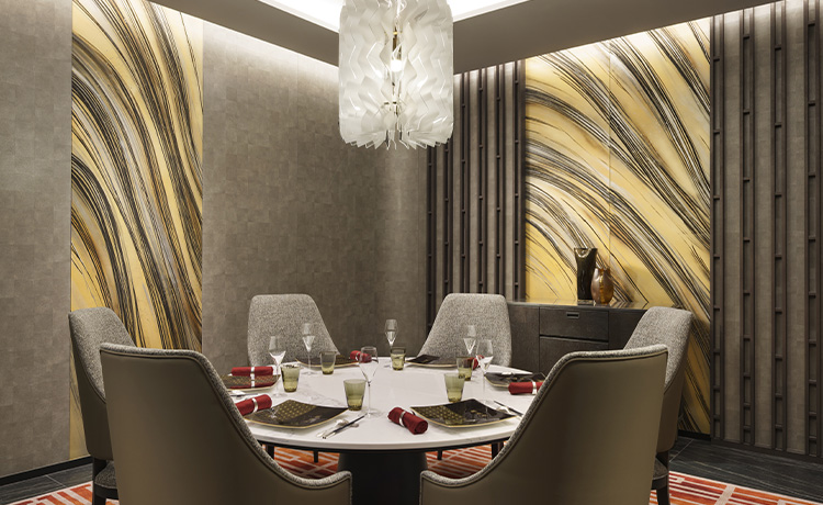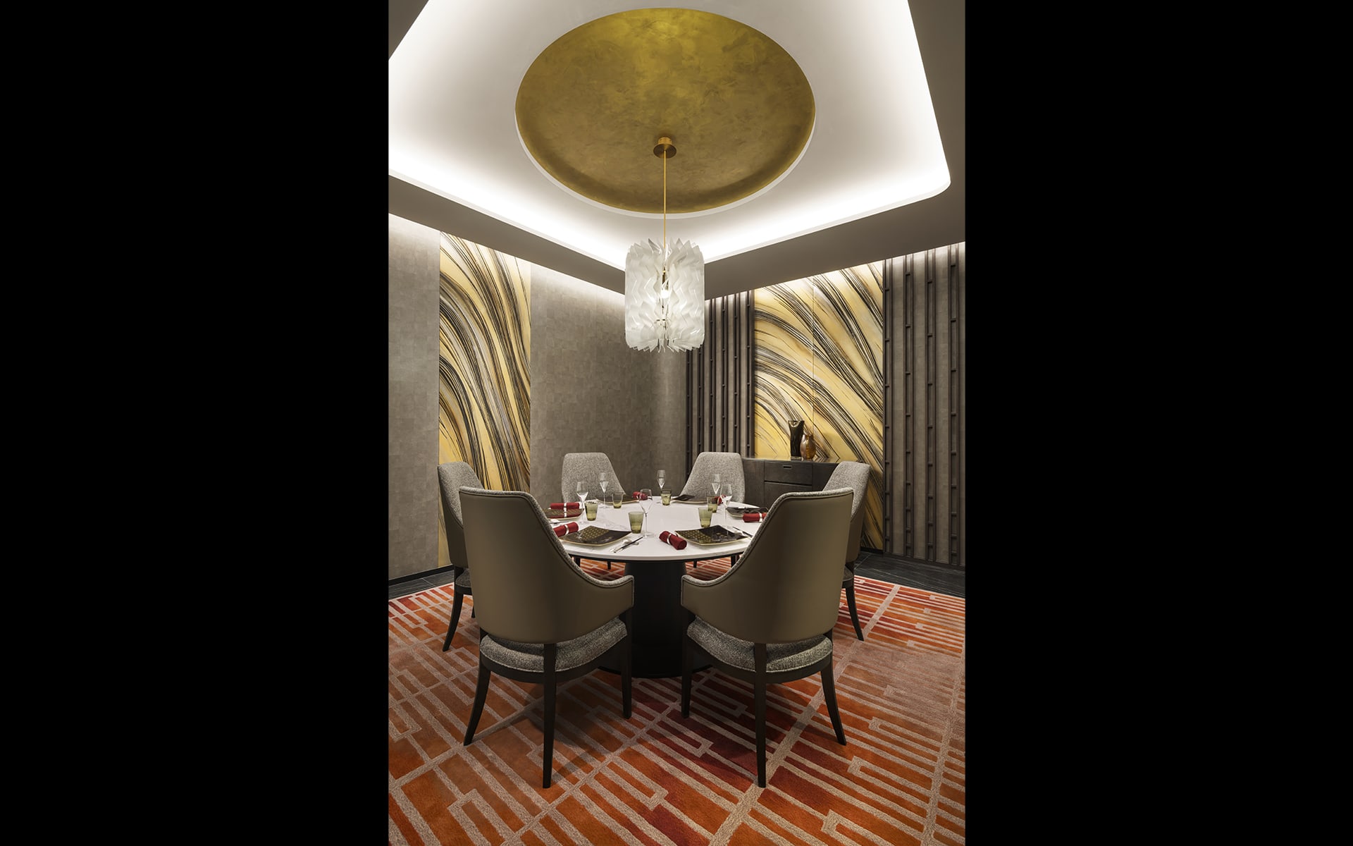 カーブした箔天井や煌めくシャンデリアなどエレガントなラグジュアリー空間で、