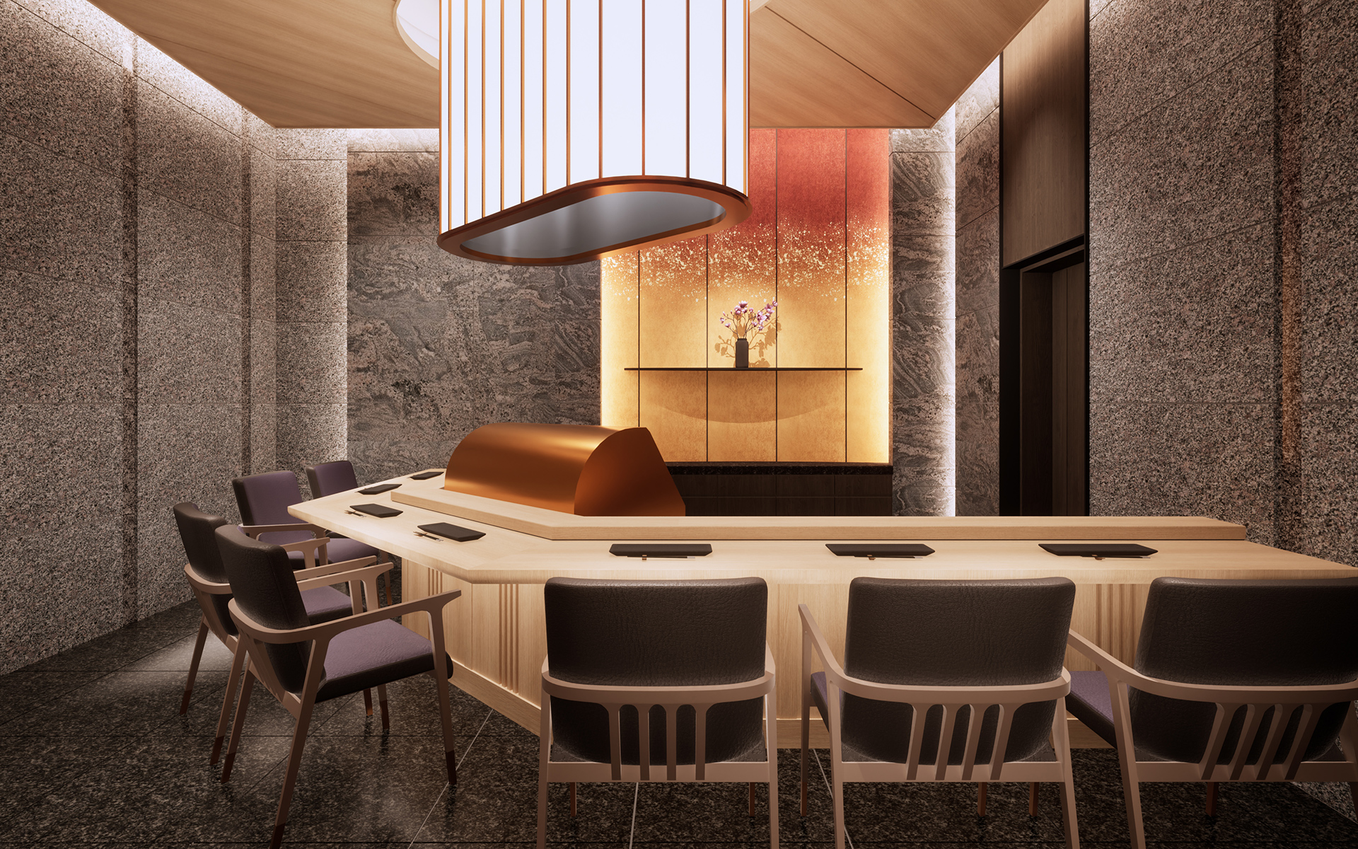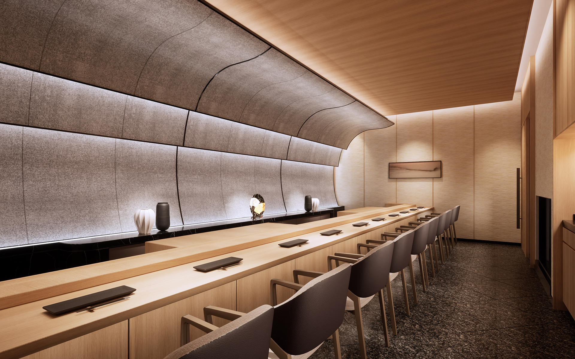 檜のカウンターにつくと、